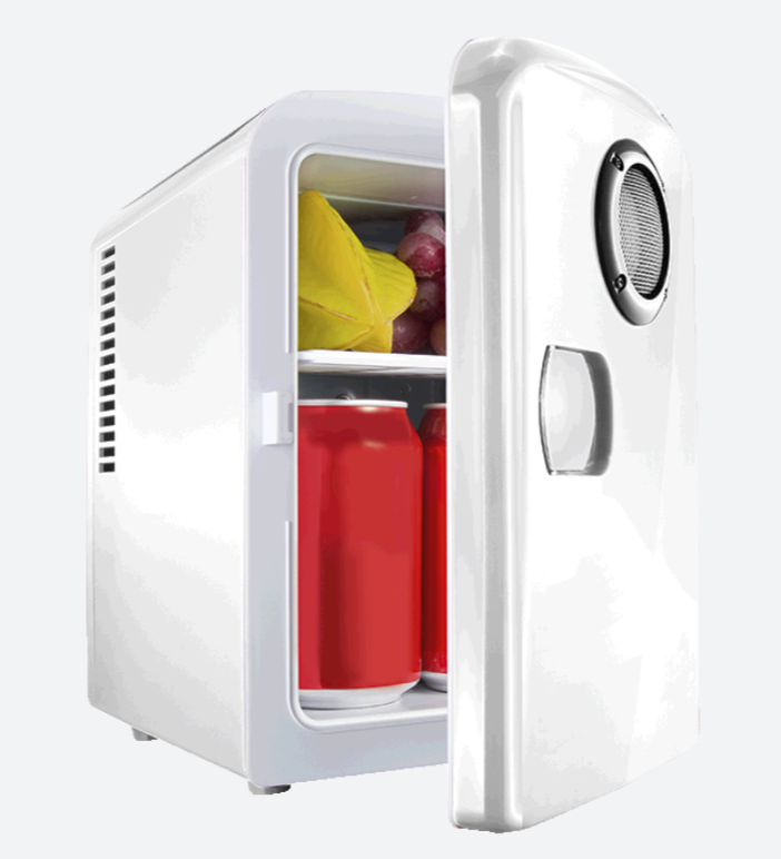 Carriable mini fridge with a built-in Bluetooth speaker, with a hot and cold setting.